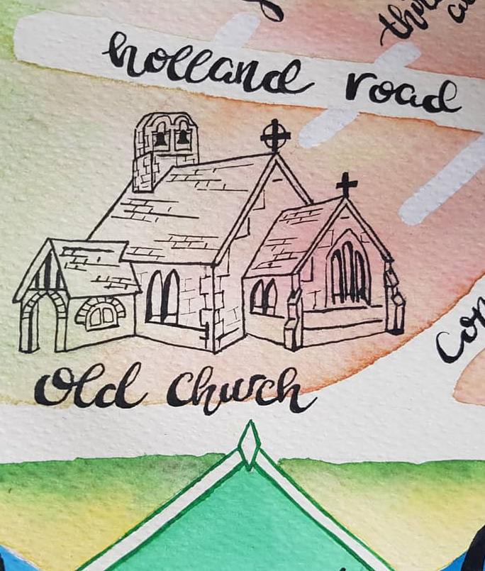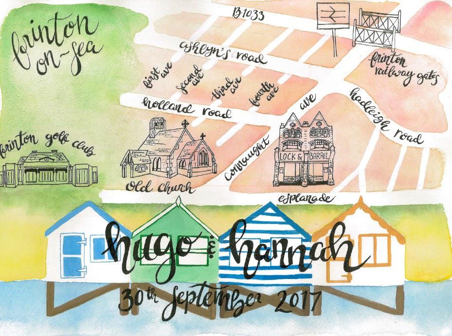 A whimsical representation of this beautiful English seaside wedding. The detailed illustrations capture the church, venue and local pub where the bride and groom invited guests to join the groom for a pre-wedding tipple. Such a lovely gesture from a fun-loving couple. I couldn’t resist adding those colourful beach huts for extra impact.