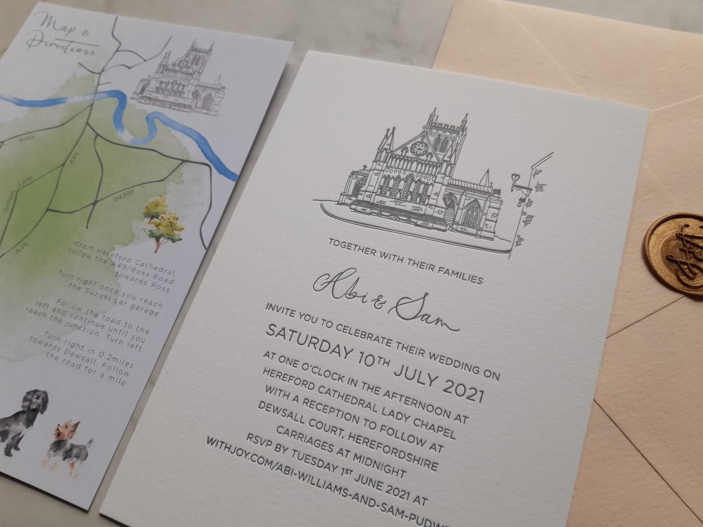Your guests will fall in love with these luxury, letterpress invitations. The design features a hand illustrated venue drawing, combined with a modern calligraphy font, and classic single-colour letterpress print.